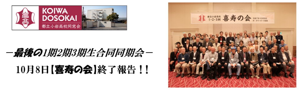 過日10月8日(水)タワーホール船堀2階(桃源の間)にて最後の1期・2期・3期合同同期会『喜寿の会』は70名が集い、小岩高校創設時三代の同期の皆さんと懐かしくも楽しく和気藹々の時間を過ごしました。