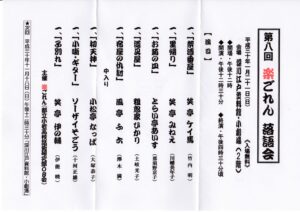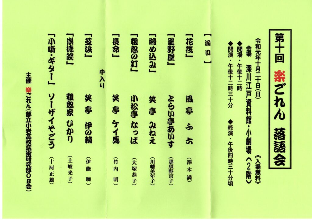 【イベント案内】楽ごれん 落語会の案内 2019 10/10 イベント案内 OB・OG 2019年10月10日 楽ごれん(都立小岩高校話術研究部OB会)の第10回落語会が以下の通り開催されます。 日時 令和元年10月20日(日) 12時開場 12:30開演 会場 深川江戸資料館・小劇場(2F) 木戸銭 無料 イベント案内 OB・OG 関連記事 5期生 髙田 啓二郎氏 遺作展開催のご案内 2026年2月9日 楽ごれん 落語会開催のお知らせ 2023年1月7日 【イベント案内】 楽ごれん 第9回落語会 2018年11月1日 髙田啓二郎 遺作展開催案内 2018年8月30日 【同窓生】広根良子 銅版画展 -ちいさな永遠- 2018年2月25日 5期生「髙田啓二郎展 25年目の再会」ご案内【更新】 2018年2月20日 第8回『楽ごれん落語会』IN 深川江戸資料館小劇場 2018年2月4日 【イベント案内】 楽ごれん 第8回落語会 2018年1月2日