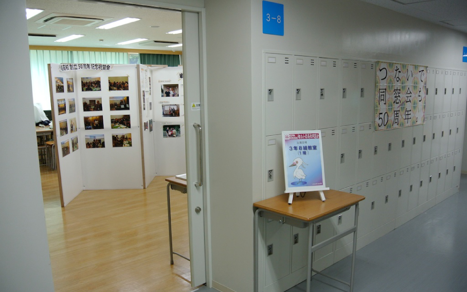 同窓会でも毎年スペースを提供して頂き参加して参りましたが、今回も生徒会の隣、1階の教室をご提供いただきブースを出展させていただきました。