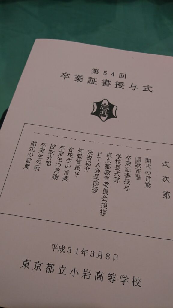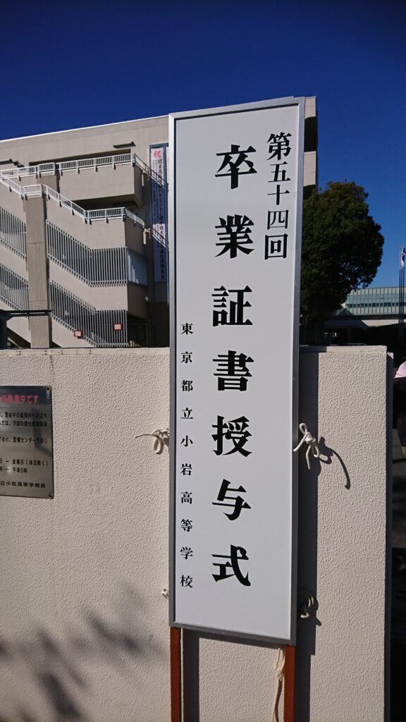前日の雨も一転快晴となり気温も12.5℃と少し上がりました。爽やかな春の日差しを浴びながらも風速4.8m/sの風がどこかの白梅の花びらを運んで小岩高校校庭に舞い降りていました。3年前の4月7日大雨の日に入学した生徒達の晴れやかな卒業式が3月8日行われました。 卒業生入場は凛々しく、卒業証書授与での名前が呼ばれる時の元気な返事には成長を感じ、また制服の胸元にはプートニアとコサージュが飾られ、とてもおしゃれでした。